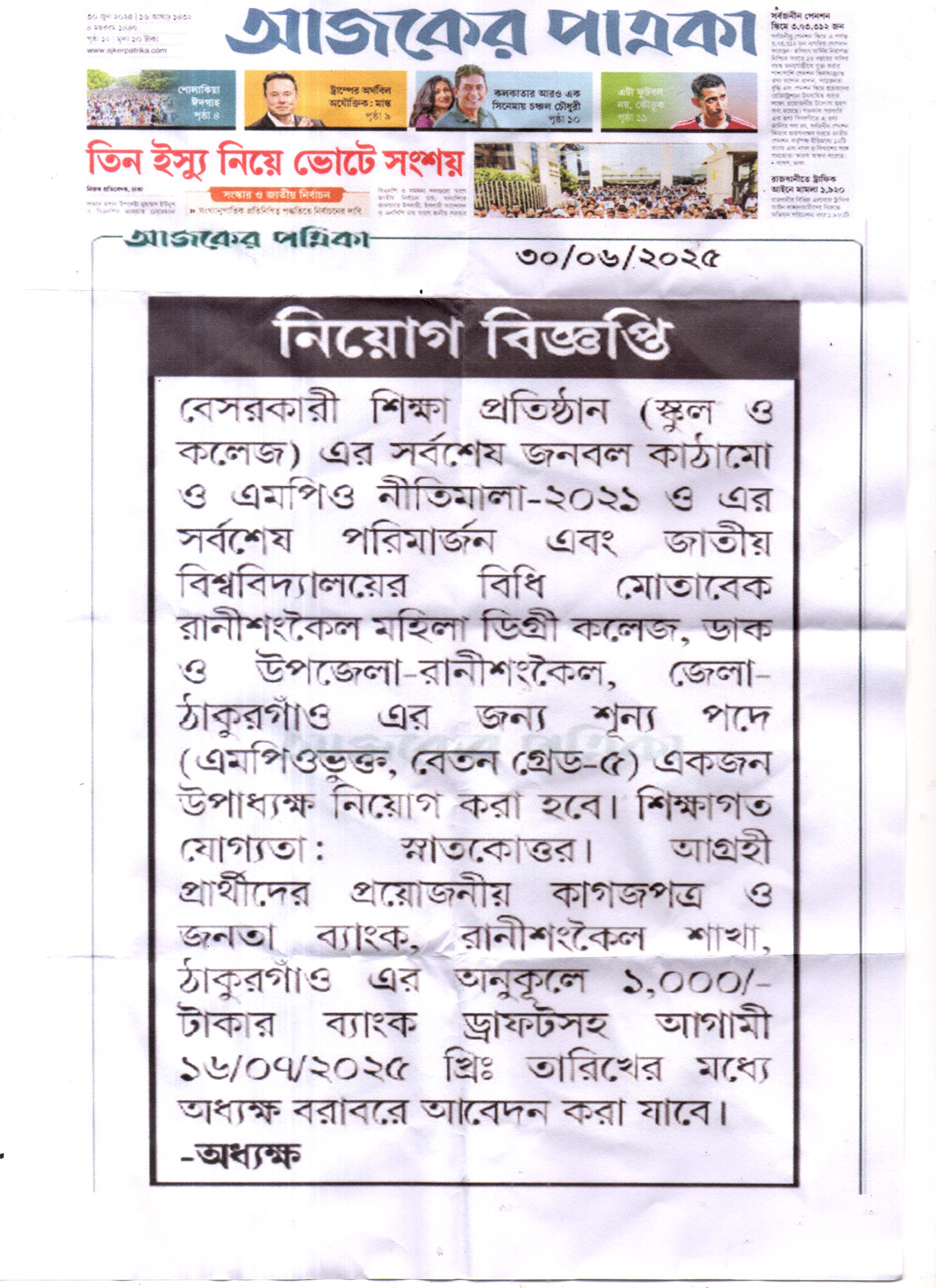 নিয়োগ বিজ্ঞপ্তি 30/06/2025 খ্রি:
